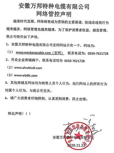 鄭重聲明:安徽萬邦特種電纜有限公司官方網站為:www_wanbangcable_com.afosm.cn,除此之外無任何子網站或合作網站,其余均為假冒偽劣。電話:0550-7621728 13485756353 地 址:安徽省天長市滁州高新技術產業開發區經四路29號